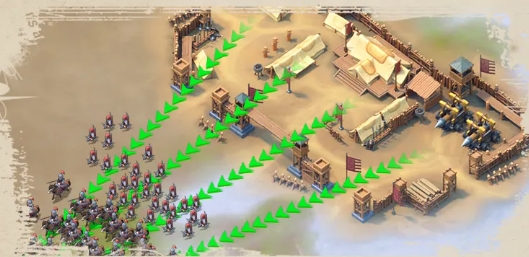 「滾木礌石」:防守方消耗輜重對云梯進行攻擊,直接砸向云梯排隊的部隊,直接重傷遣返回去。